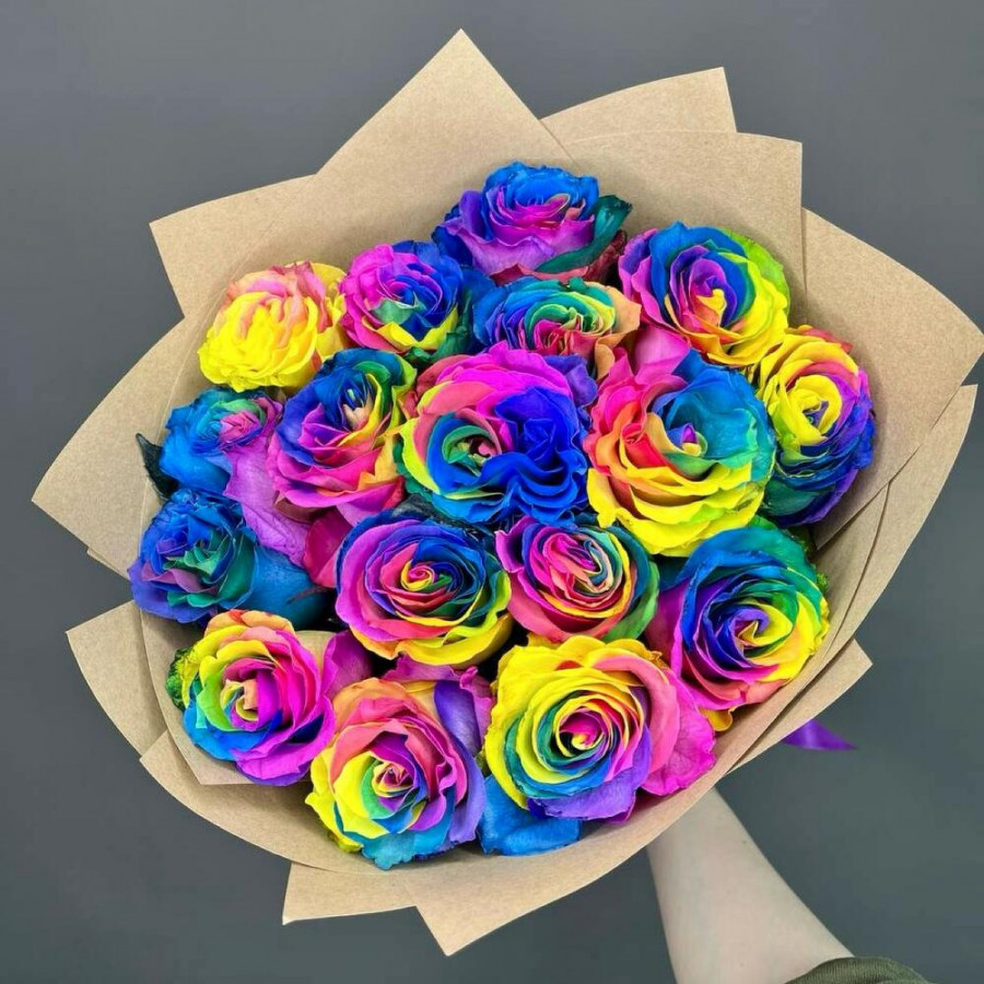 На фото букет из 17 радужных роз. В составе: роза 17 шт, крафт-бумага 2 шт, атласная лента 1 шт, . Все цветы свежие и ароматные, букет красиво оформлен и отлично подходит для подарка. Доступна доставка цветов или самовывоз.