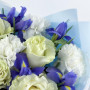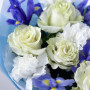 Букет из белых гвоздик, синих ирисов и белых роз в Новомичуринске