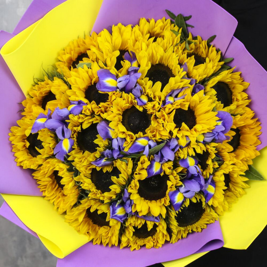 На фото букет из подсолнухов и ирисов. В составе: подсолнух 21 шт, ирис 8 шт, писташ 2 шт, дизайнерская упаковка 1 шт, атласная лента 1 шт, . Все цветы свежие и ароматные, букет красиво оформлен и отлично подходит для подарка. Доступна доставка цветов или самовывоз.