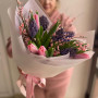 На фото букет из тюльпанов и гиацинтов. В составе: гиацинт 5 шт, тюльпан 7 шт, хамелациум 3 шт, крафт-бумага 1 шт, . Все цветы свежие и ароматные, букет красиво оформлен и отлично подходит для подарка. Доступна доставка цветов или самовывоз.
