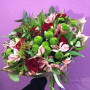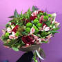 Яркое необычное сочетание зеленых кустовых хризантем, насыщенно бордовых роз, искристых веточек альстромерий и густой экзотической зелени - это не только оригинальный самостоятельный подарок, но и чудесное дополнение к любому празднику. Такой букет вызовет восхищение даже у самых изысканных представительниц прекрасного пола.